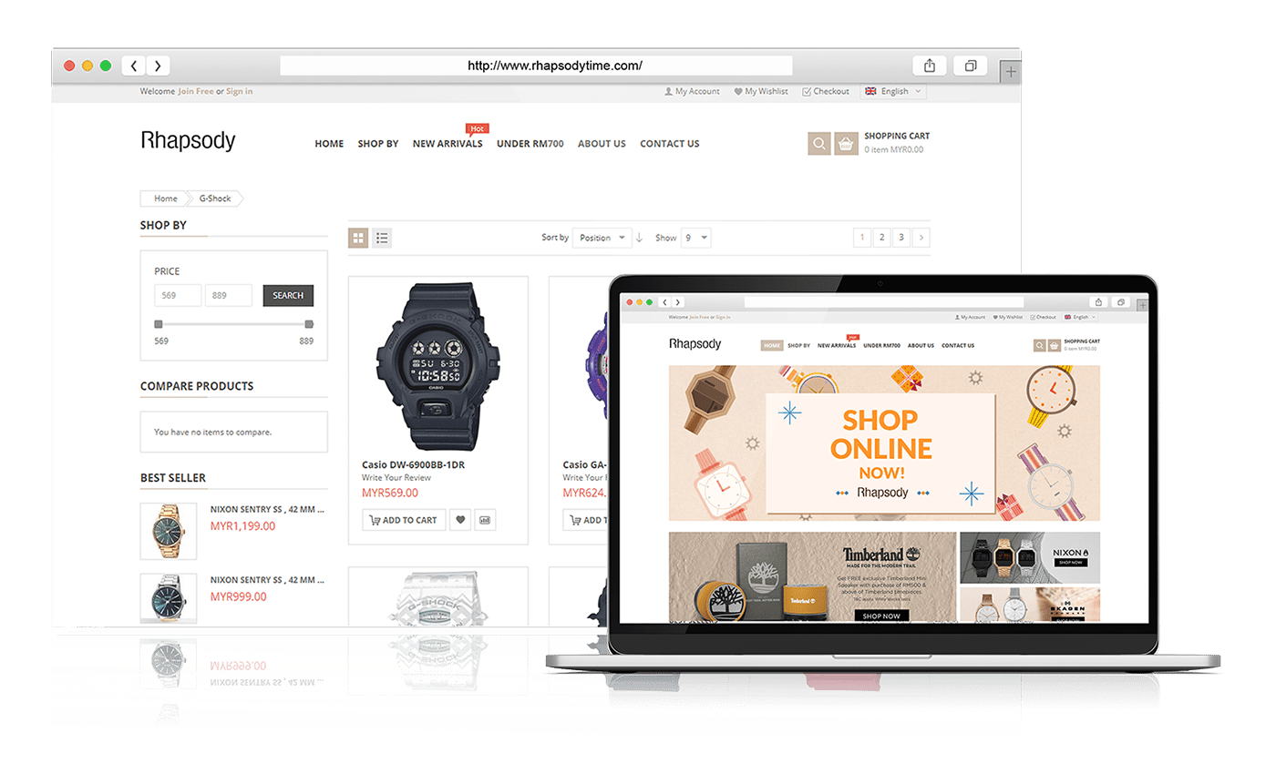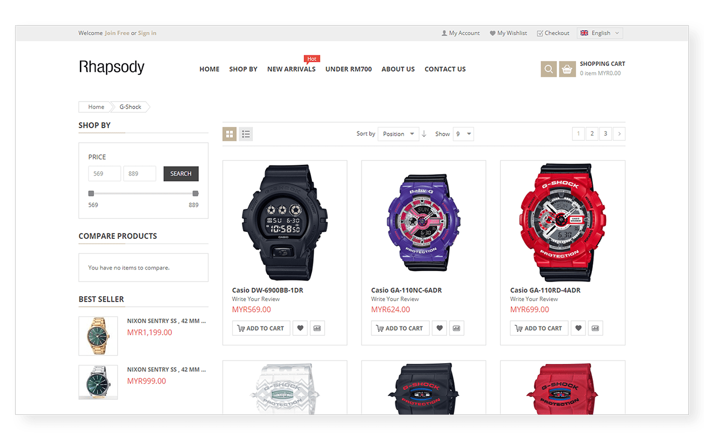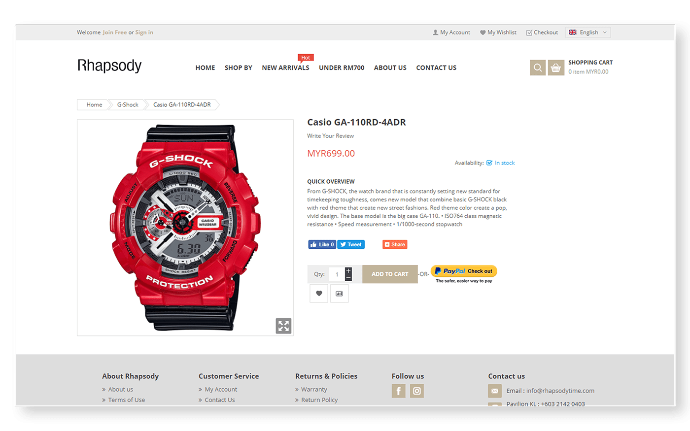 Multiple payment options, wishlist, social media engagement, comparisons and full-page view on the product page allows for the entire sales funnel to happen in each product page.
